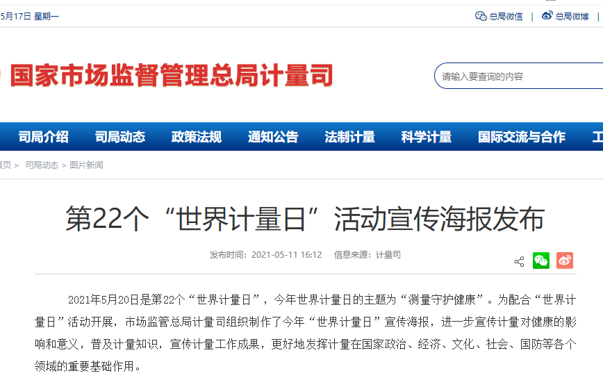 2021年5月20日是第22個“世界計量日”,今年世界計量日的主題為“測量守護健康”。為配合“世界計量日”活動開展,市場監(jiān)管總局計量司組織制作了今年“世界計量日”宣傳海報,進一步宣傳計量對健康的影響和意義,普及計量知識,宣傳計量工作成果,更好地發(fā)揮計量在國家政治、經(jīng)濟、文化、社會、國防等各個領(lǐng)域的重要基礎(chǔ)作用。