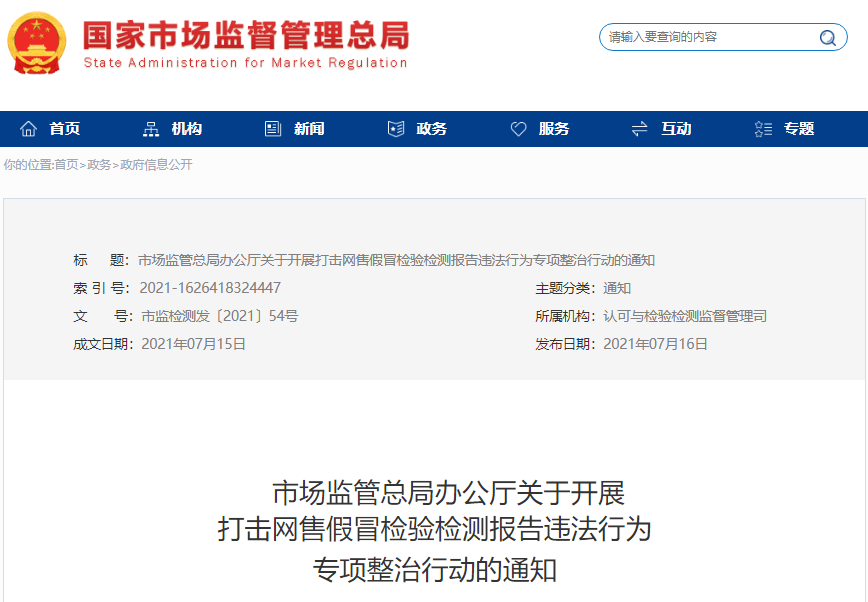 市場監(jiān)管總局辦公廳關(guān)于開展打擊網(wǎng)售假冒檢驗檢測報告違法行為專項整治行動的通知