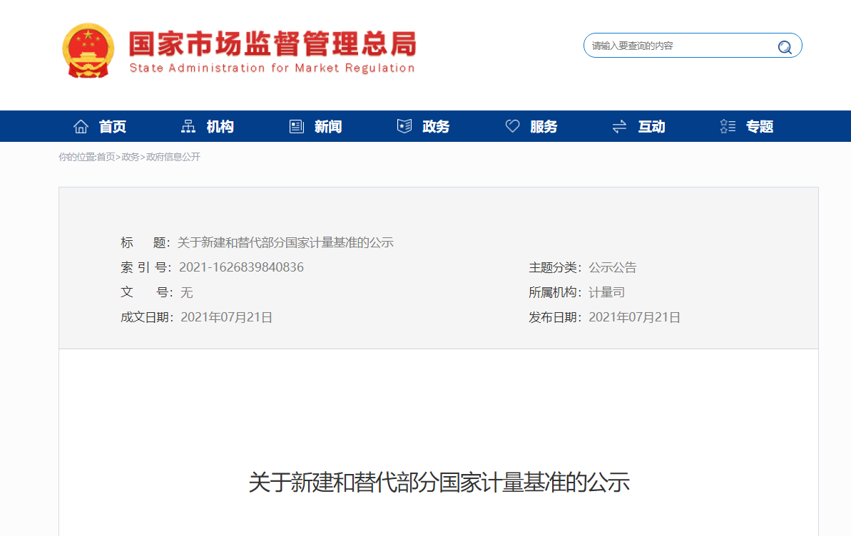 市場監(jiān)管總局發(fā)布關(guān)于新建和替代部分國家計量基準的公示