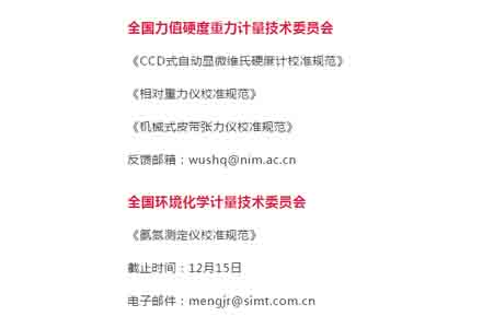 近日,全國力值硬度重力計量技術委員會、全國環境化學計量技術委員會發布《CCD式自動顯微維氏硬度計校準規范》、《相對重力儀校準規范》、《機械式皮帶張力儀校準規范》、《氨氮測定儀校準規范》等4項國家計量技術規范征求意見稿。