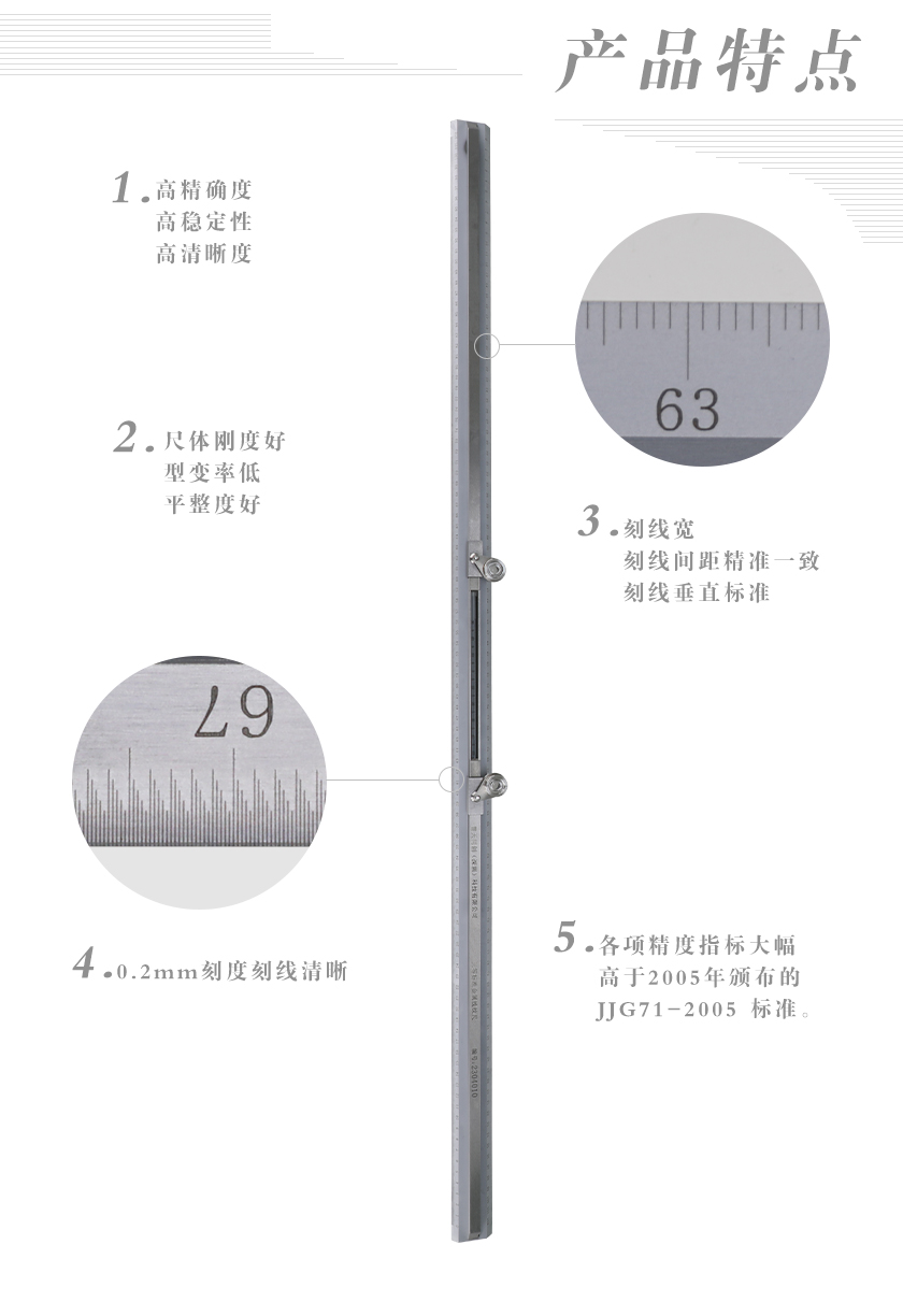 普天同創(深圳)科技有限公司自己主研發PTTC-ZC1型三等標準金屬線紋尺,作為自主知識產權的高科技、創新型二十一世紀新產品,集現代科技、加工中心全自動化制作工藝技術,采用激光刻制刻劃線、標選讀數與圖型。產品具有高精確度、高穩定性、高清晰度,刻線寬、刻線間距精準一致,刻線垂直標準,尺體剛度好,型變率低,平整度好,各項精度指標大幅高于2005年頒布的JJG71-2005 標準。