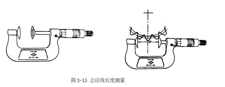 公法線長度千分尺如圖3-15所示。主要用于測量外嚙合圓柱齒輪的兩個不同齒面公法線長度,也可以在檢驗切齒機床精度時,按被切齒輪的公法線檢查其原始外形尺寸。它的結構與外徑百分尺相同,所不同的是在測量面上裝有兩個帶精確平面的量鉗(測量面)來代替原來的測砧面。