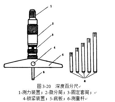 深度百分尺的讀數(shù)范圍(mm):0~25,25~100,100~150, 讀數(shù)值(mm)為0.01。它的測量桿6制成可更換的形式, 更換后,用鎖緊裝置4鎖緊。 深度百分尺校對(duì)零位可在精密平面上進(jìn)行。即當(dāng)基座端面與測量桿端面位于同一平面時(shí),微分筒的零線正好對(duì)準(zhǔn)。當(dāng)更換測量桿時(shí),一般零位不會(huì)改變。
