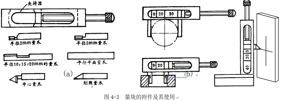 為了擴(kuò)大量塊的應(yīng)用范圍,便于各種測量工作,可采用成套的量塊附件。量塊附件中,主要的是不同長度的夾持器和各種測量用的量腳,如圖4-3(a)所示。量塊組與量塊附件裝置后,可用作校準(zhǔn)量具尺寸(如內(nèi)徑百分尺的校準(zhǔn)),測量軸徑、孔徑、高度和劃線等工作,如圖4-3(b)所示。