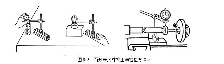 3 用百分表校正或測量零件時(shí),如圖5-5所示。應(yīng)當(dāng)使測量桿有一定的初始測力。即在測量頭與零件表面接觸時(shí),測量桿應(yīng)有0.3~1mm的壓縮量(千分表可小一點(diǎn),有0.1mm即可),使指針轉(zhuǎn)過半圈左右,然后轉(zhuǎn)動(dòng)表圈,使表盤的零位刻線對準(zhǔn)指針。輕輕地拉動(dòng)手提測量桿的圓頭,拉起和放松幾次,檢查指針?biāo)傅牧阄挥袩o改變。當(dāng)指針的零位穩(wěn)定后,再開始測量或校正零件的工作。如果是校正零件,此時(shí)開始改變零件的相對位置,讀出指針的偏擺值,就是零件安裝的偏差數(shù)值。