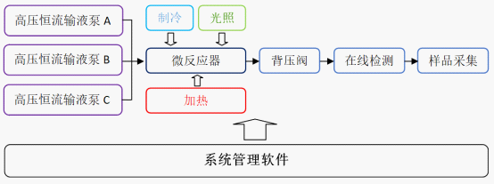 如圖所示,物料通過高壓輸液泵輸送到微反應器中,在高壓密閉的微通道管路中,通過溫度控制,,使合成反應能夠快速完成并極大提高收率,背壓閥能夠人為控制反應器內壓力,物料在出口處通過在線檢測器檢測合成結果,經過檢測后的產品可通過樣品采集器按預設的收集條件收集到不同的容器中。整個反應系統可通過管理軟件實現自動控制,具有方法建立、模塊搭建、模塊參數設置,全反應過程參數實時監控,數據追溯,用戶管理及智能專家數據庫等功能,專用管理軟件可將整個反應體系效率發揮到極致。