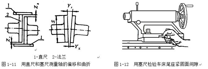 塞尺又稱厚薄規或間隙片。主要用來檢驗機床特別緊固面和緊固面、活塞與氣缸、活塞環槽和活塞環、十字頭滑板和導板、進排氣閥頂端和搖臂、齒輪嚙合間隙等兩個結合面之間的間隙大小。塞尺是由許多層厚薄不一的薄鋼片組成(圖1-10)按照塞尺的組別制成一把一把的塞尺,每把塞尺中的每片具有兩個平行的測量平面,且都有厚度標記,以供組合使用。