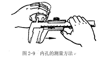 4 當測量零件的內尺寸時:圖2-9所示。要使量爪分開的距離小于所測內尺寸,進入零件內孔后,再慢慢張開并輕輕接觸零件內表面,用固定螺釘固定尺框后,輕輕取出卡尺來讀數。取出量爪時,用力要均勻,并使卡尺沿著孔的中心線方向滑出,不可歪斜,免使量爪扭傷;變形和受到不必要的磨損,同時會使尺框走動,影響測量精度。