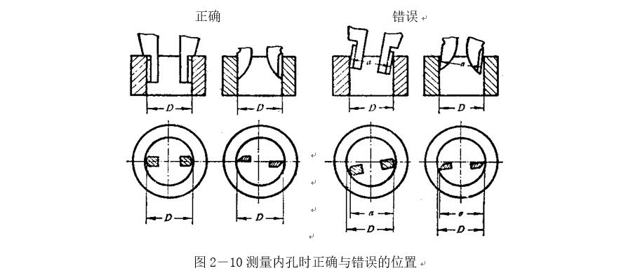 卡尺兩測量刃應在孔的直徑上,不能偏歪。圖2-10為帶有刀口形量爪和帶有圓柱面形量爪的游標卡尺,在測量內孔時正確的和錯誤的位置。當量爪在錯誤位置時,其測量結果,將比實際孔徑D要小。
