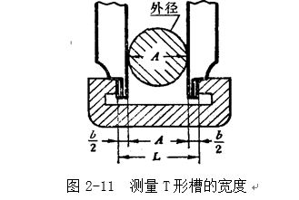 用游標(biāo)卡尺測量T形槽的寬度,如圖2-11所示。測量時將量爪外緣端面的小平面,貼在零件凹槽的平面上,用固定螺釘把微動裝置固定,轉(zhuǎn)動調(diào)節(jié)螺母,使量爪的外測量面輕輕地與T形槽表面接觸,并放正兩量爪的位置 (可以輕輕地擺動一個量爪,找到槽寬的垂直位置),讀出游標(biāo)卡尺的讀數(shù)圖2-11中用A表示。但由于它是用量爪的外測量面測量內(nèi)尺寸的,卡尺上所讀出的讀數(shù)A是量爪內(nèi)測量面之間的距離,因此必須加上兩個量爪的厚度b,才是T形槽的寬度。所以,T形槽的寬度L=A+b。
