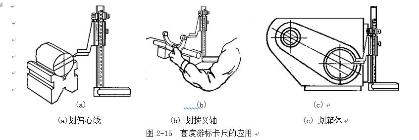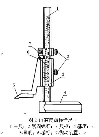 高度游標卡尺如圖2-14所示,用于測量零件的高度和精密劃線。它的結構特點是用質量較大的基座4代替固定量爪5,而動的尺框3則通過橫臂裝有測量高度和劃線用的量爪,量爪的測量面上鑲有硬質合金,提高量爪使用壽命。高度游標卡尺的測量工作,應在平臺上進行。當量爪的測量面與基座的底平面位于同一平面時,如在同一平臺平面上,主尺1與游標6的零線相互對準。所以在測量高度時,量爪測量面的高度,就是被測量零件的高度尺寸,它的具體數值,與游標卡尺一樣可在主尺(整數部分)和游標 (小數部分)上讀出。應用高度游標卡尺劃線時,調好劃線高度,用緊固螺釘2把尺框鎖緊后,也應在平臺上進行先調整再進行劃線。